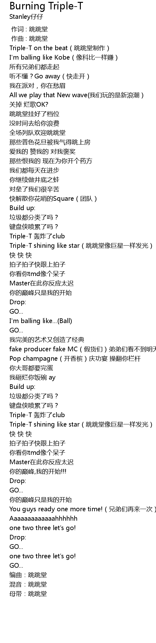 | [00:01.013] | TripleT on the beat tiào tiào táng zhì zuò |