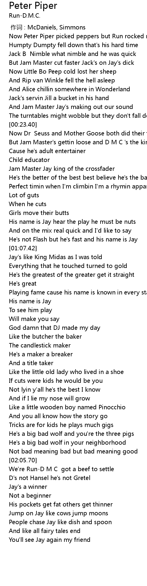 | [00:00.66] | Now Peter Piper picked peppers but Run rocked rhymes |