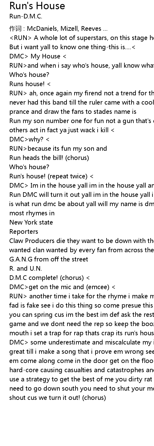 | RUN another time i take for the rhyme i make make me mad and sad because the fad is fake see i do this thing so come presue this king one mind i rhyme is all you can spring cus im the best im def ask the rest they left thats my name my game and we dont need the rep so keep the booze you loose and suckas cool your mouth i set a trap for rap thats crap its run' s house! chorus | |