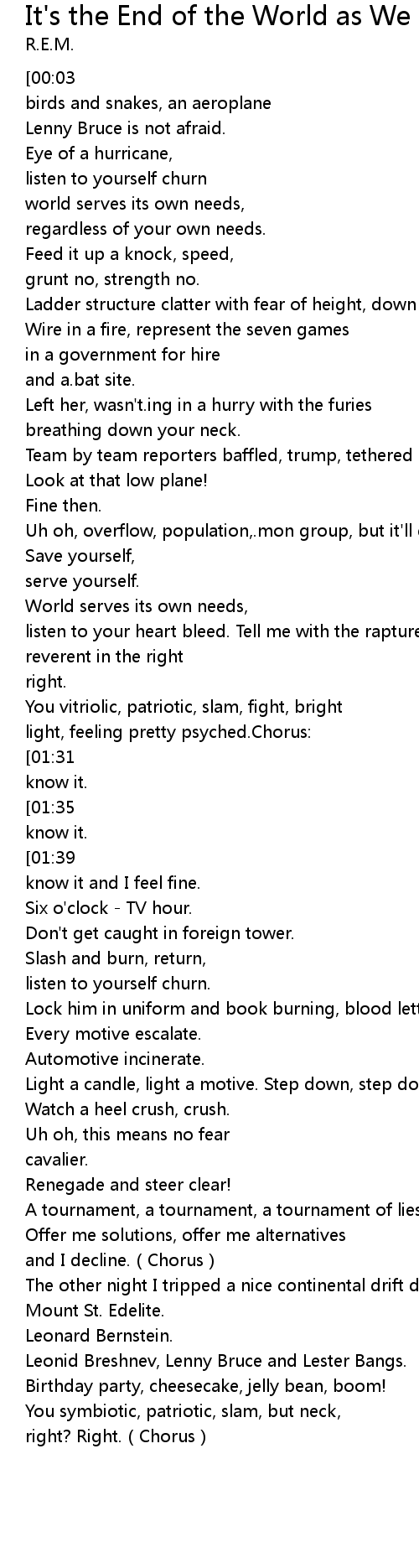 | [00:57][01:39][02:12][02:45][03:08][03:27][03:45] | It' s the end of the world as we know it and I feel fine. |