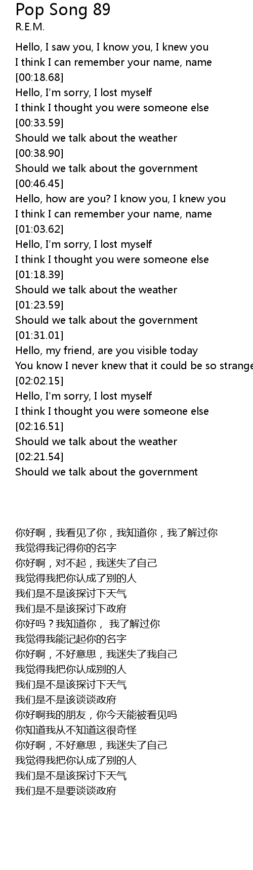 | [00:56.48] | Hello, how are you? I know you, I knew you |
