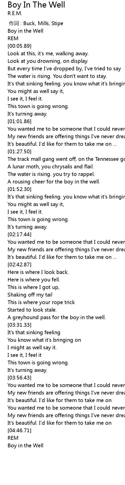 | [05:05.12] | Boy in the Well |