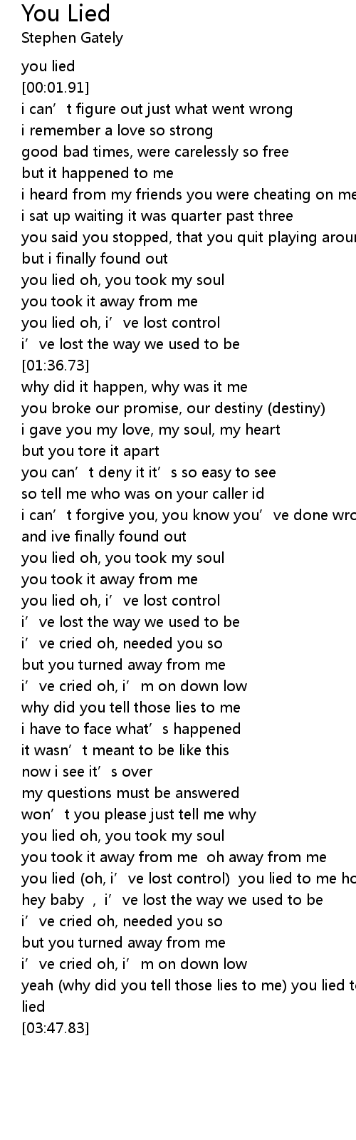 | [03:43.27] | yeah why did you tell those lies to me you lied to me baby , you lied |