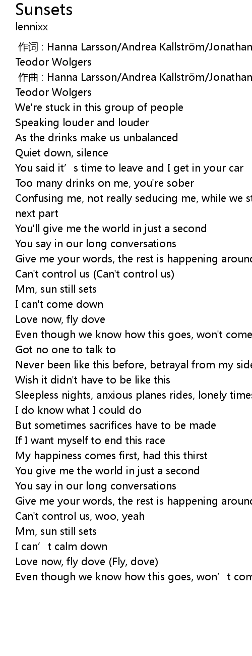 | [00:00.000] | 作词 : Hanna Larsson/Andrea Kallström/Jonathan Lavotha/Erik Teodor Wolgers |