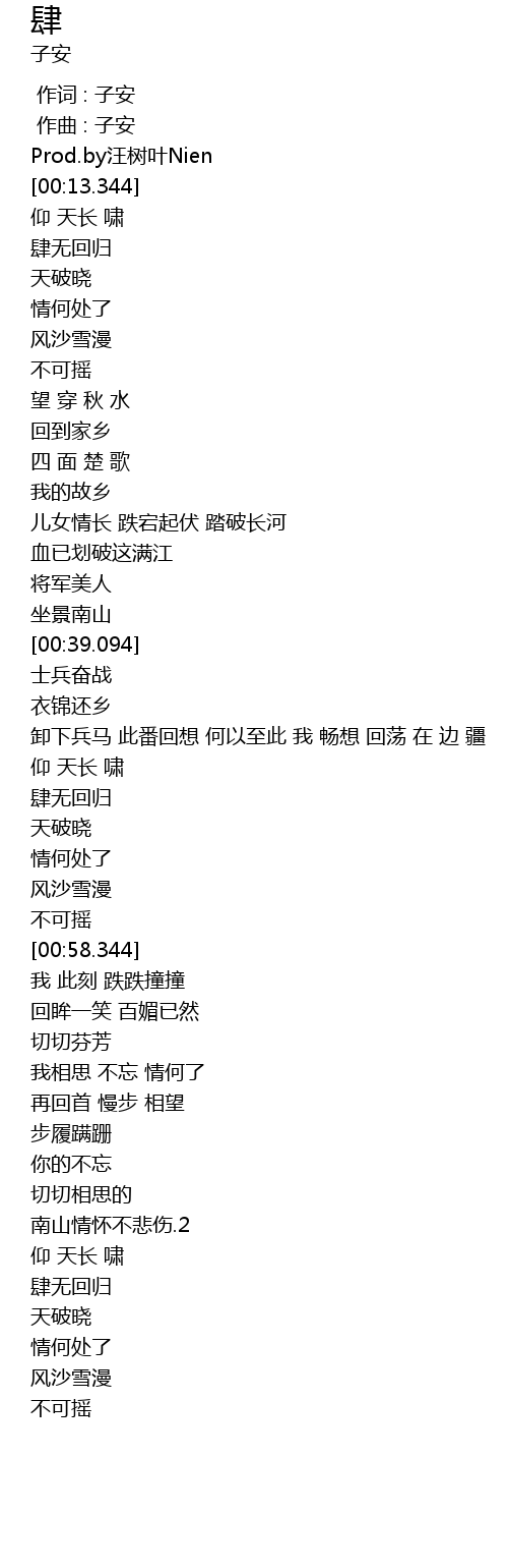 | [00:40.844] | 卸下兵马 此番回想 何以至此 我 畅想 回荡 在 边 疆 |