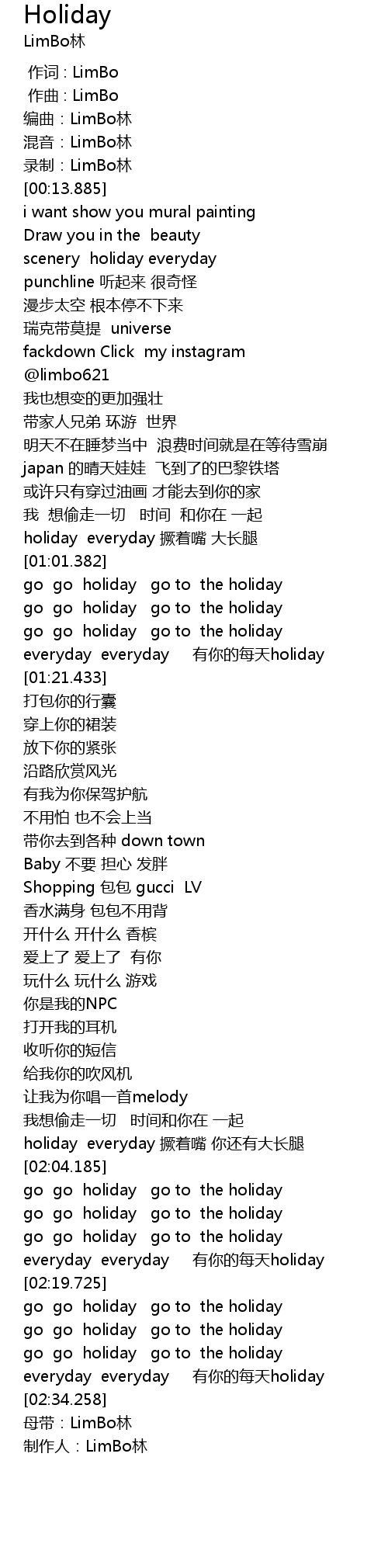 | [02:00.928] | holiday everyday 撅着嘴 你还有大长腿 |