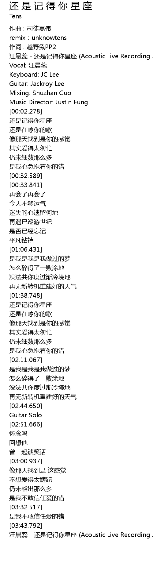 | [03:44.794] | 汪晨蕊 - 还是记得你星座 (Acoustic Live Recording 2018) |
