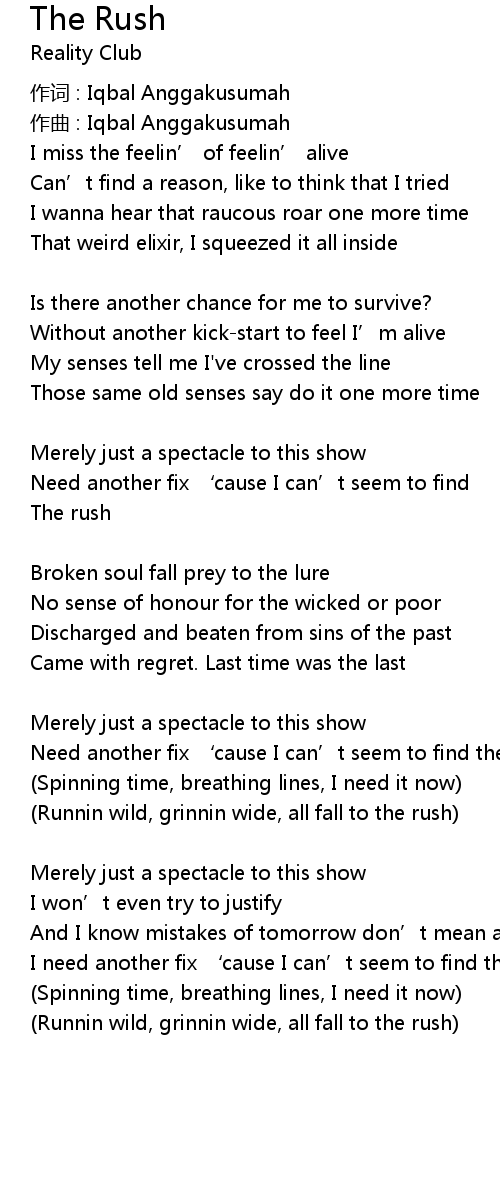 | Need another fix ‘cause I can’t seem to find the rush | |