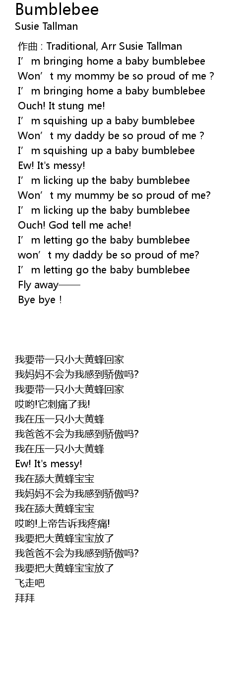 | [00:07.207] | I' m bringing home a baby bumblebee |