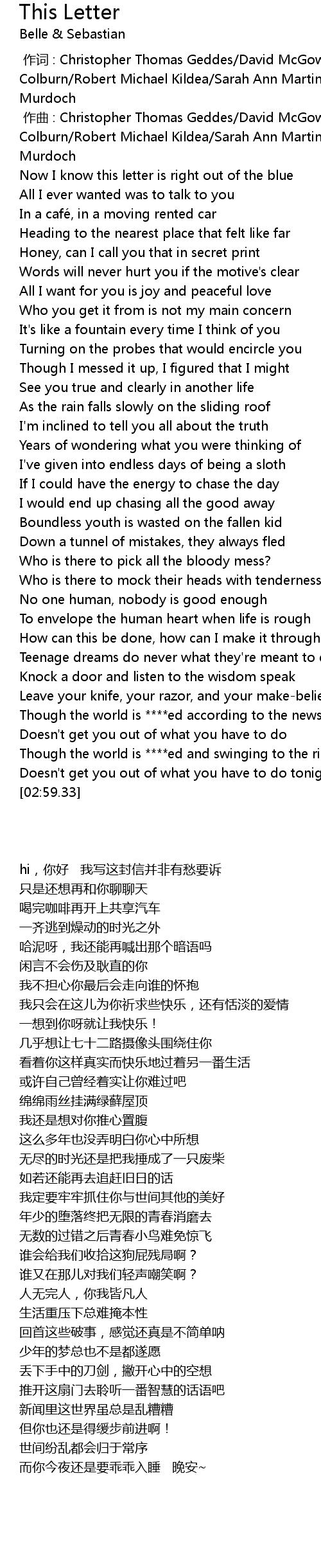 | [00:15.78] | Now I know this letter is right out of the blue |