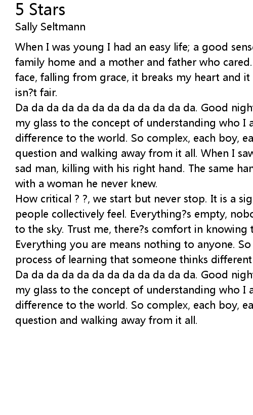 Da da da da da da da da da da da da. Good night and good luck to you. I?ll raise my glass to the concept of understanding who I am. And how this can make a difference to the world. So complex, each boy, each girl. 5 stars for asking a question and walking away from it all.