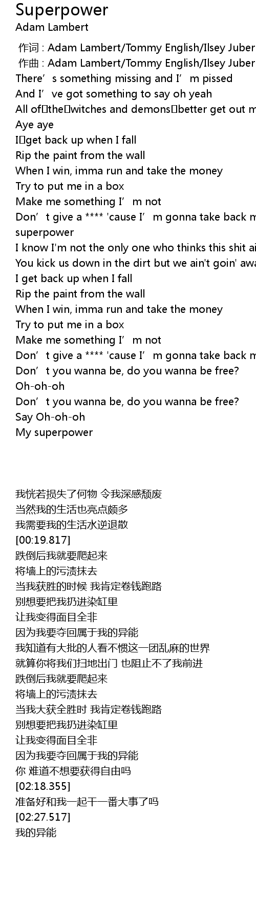 | [00:37.239] | Don’t give a **** 'cause I’m gonna take back my superpower, my superpower |