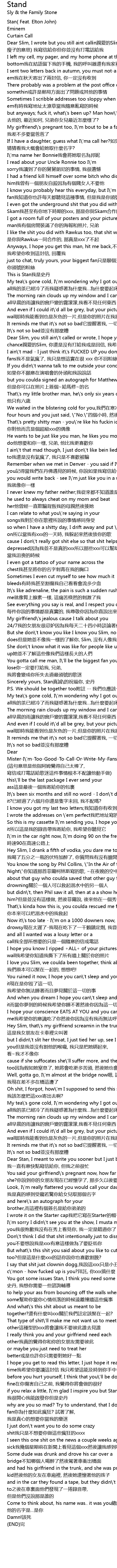 | I ain\'t mad - I just think it\'s FUCKED UP you don\'t answer fans我不是氣瘋了, 我只是想這實在很 xxx 你不回粉絲的信 | |