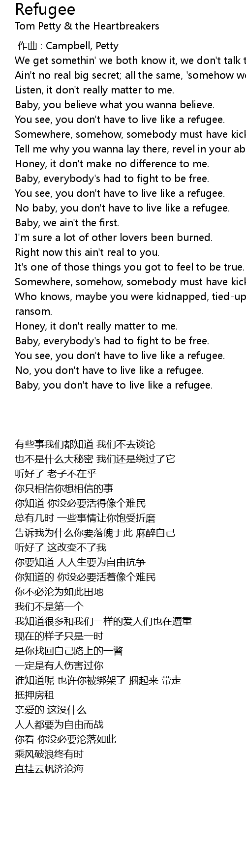 | [01:23.02] | No baby, you don't have to live like a refugee. |