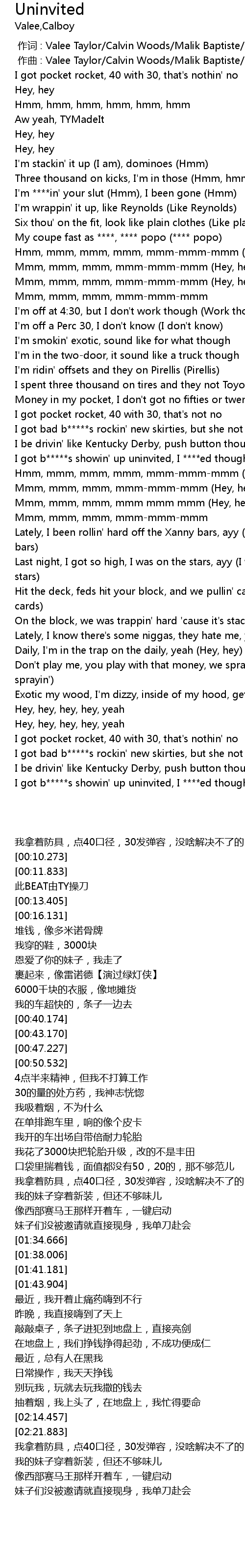 | [02:37.368] | I got b*****s showin' up uninvited, I ****ed though |