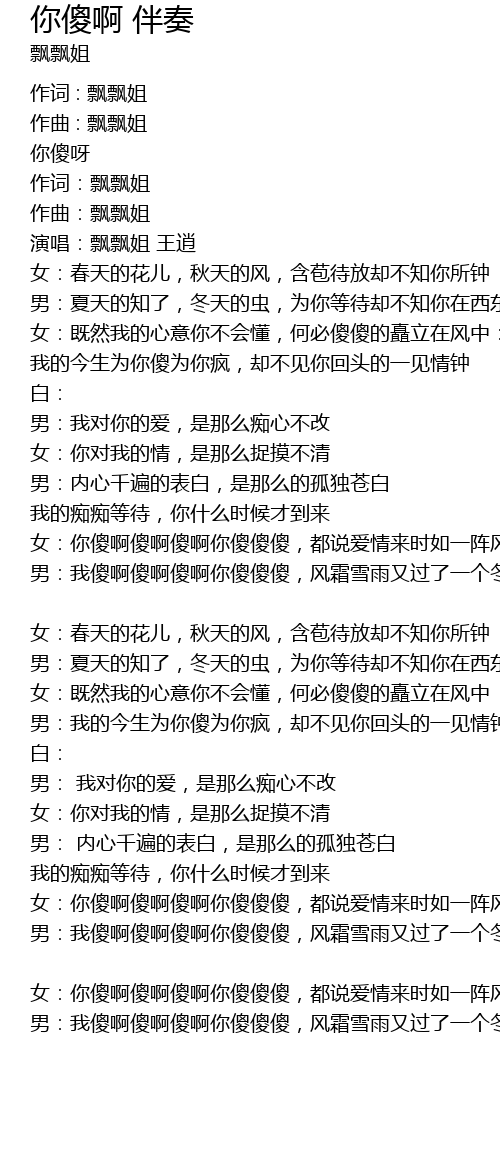 | nán: wǒ shǎ a shǎ a shǎ a nǐ shǎ shǎ shǎ, fēng shuāng xuě yǔ yòu guò le yí gè dōng, ài qíng bù néng děng dài hòu huǐ yǐ chéng kōng | |