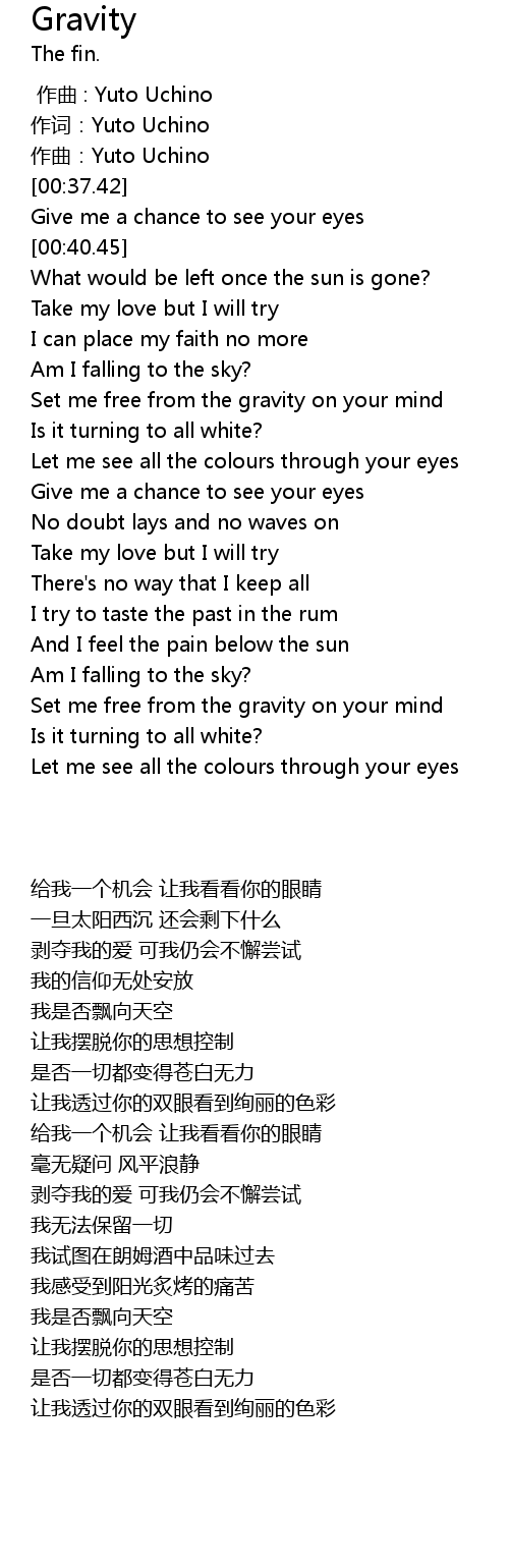 | [01:15.51] | Set me free from the gravity on your mind |