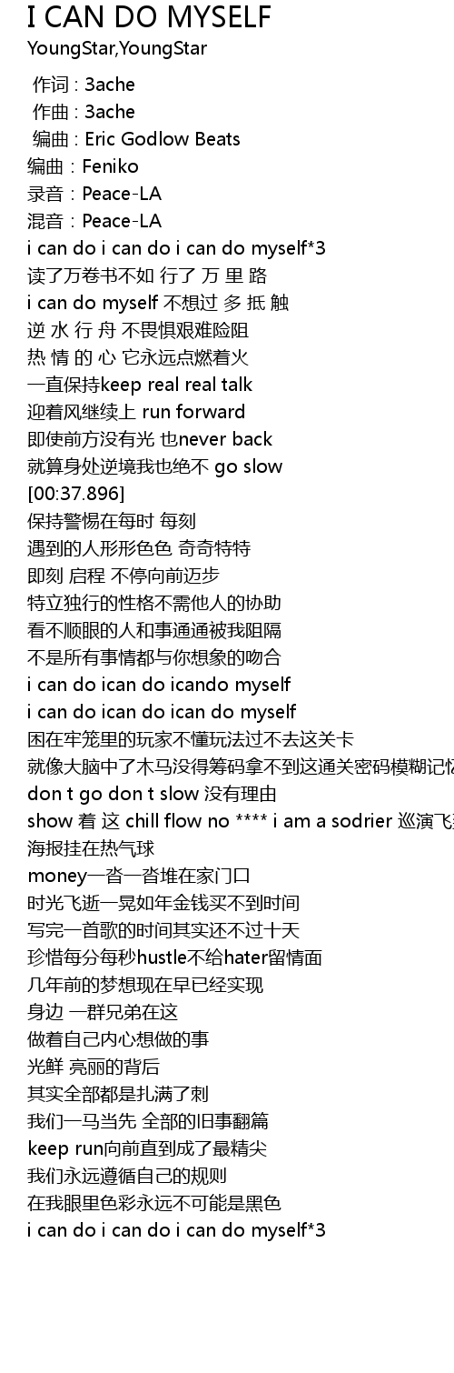 | [00:21.092] | i can do myself bu xiang guo duo di chu |