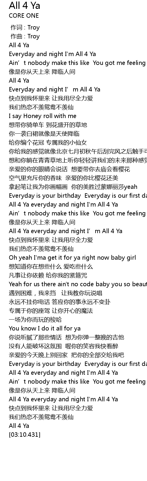 | [01:35.087] | All 4 Ya everyday and night I' m All 4 Ya |