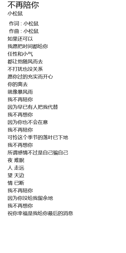 | [00:51.452] | wǒ bù zài péi nǐ |