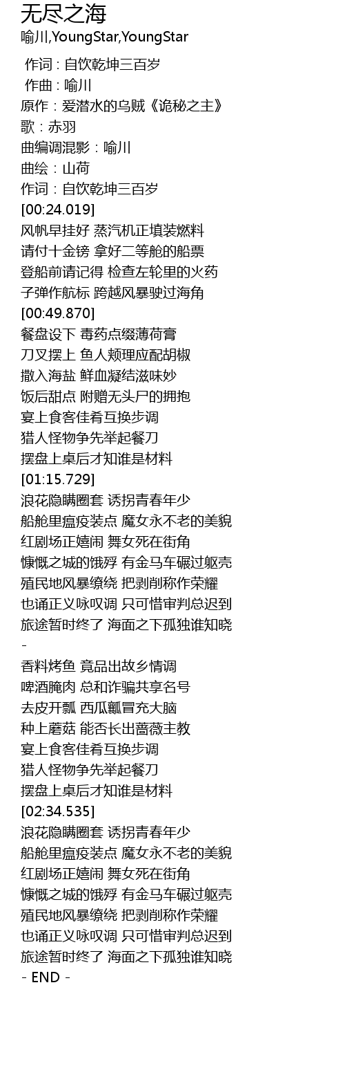 | [03:04.400] | 船舱里瘟疫装点 魔女永不老的美貌 |