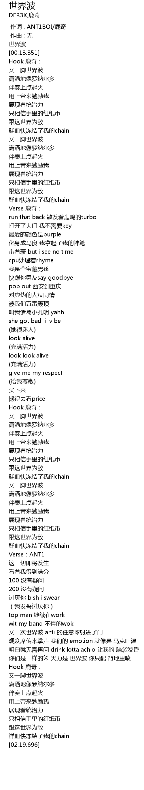 | [00:00.000] | 作词 : ANT1BOI/鹿奇 |
