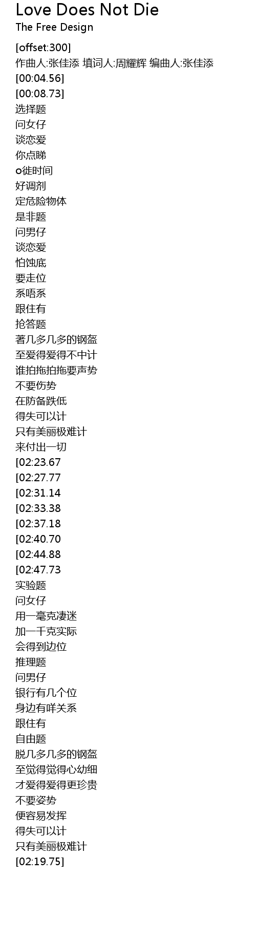 | [00:02.37] | 作曲人:张佳添 填词人:周耀辉 编曲人:张佳添 |