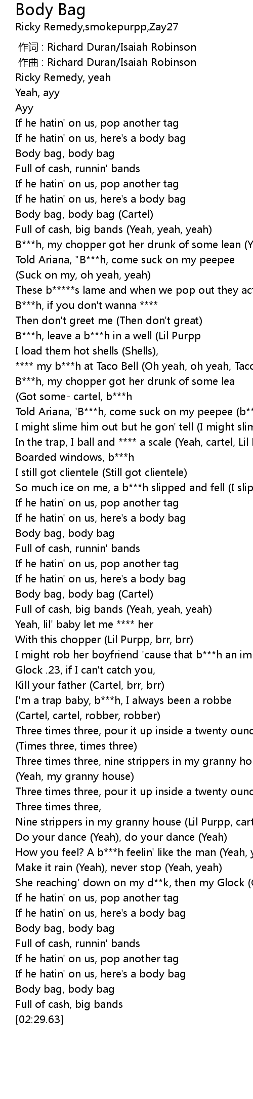 | [01:25.91] | Body bag, body bag (Cartel) |