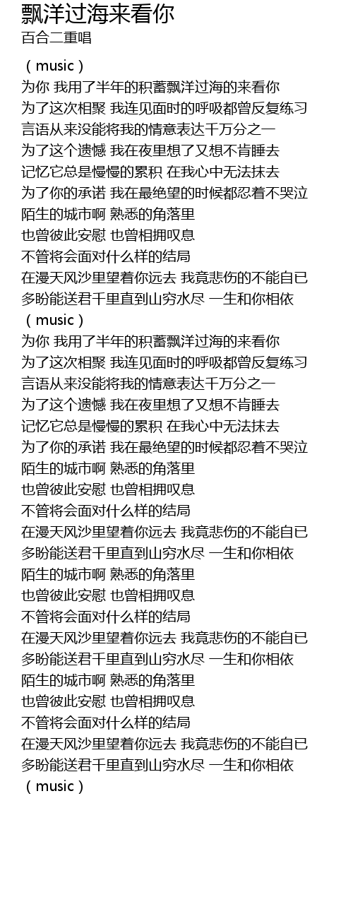 | [02:27.300] | wèi nǐ wǒ yòng le bàn nián de jī xù piāo yáng guò hǎi de lái kàn nǐ |