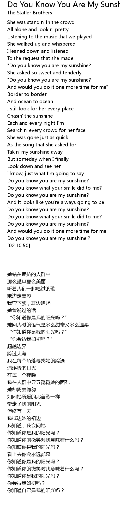 | [01:38.65] | Do you know you are my sunshine? |
