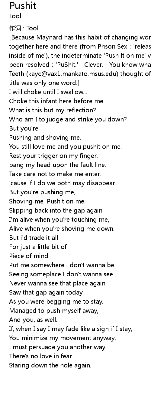 inside of me'), the indeterminate 'Push It on me' vs. 'Shit on me' has