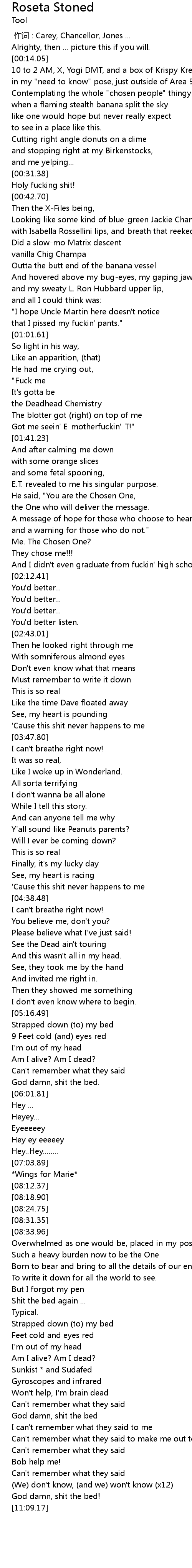 | [00:16.06] | 10 to 2 AM, X, Yogi DMT, and a box of Krispy Kremes, |