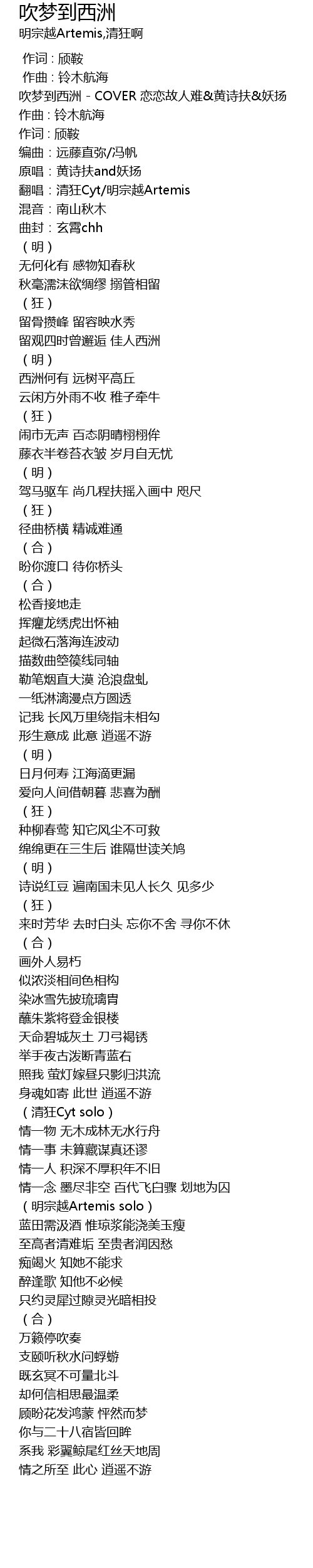 | [00:07.118] | chuī mèng dào xī zhōu COVER liàn liàn gù rén nán huáng shī fú yāo yáng |