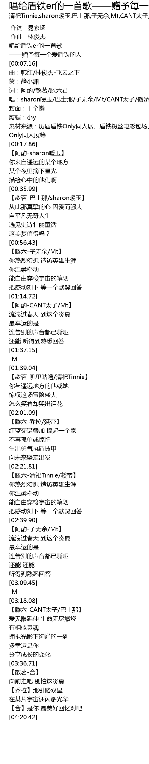 | Song | 唱给盾铁er的一首歌——赠予每一个爱盾铁的人 |