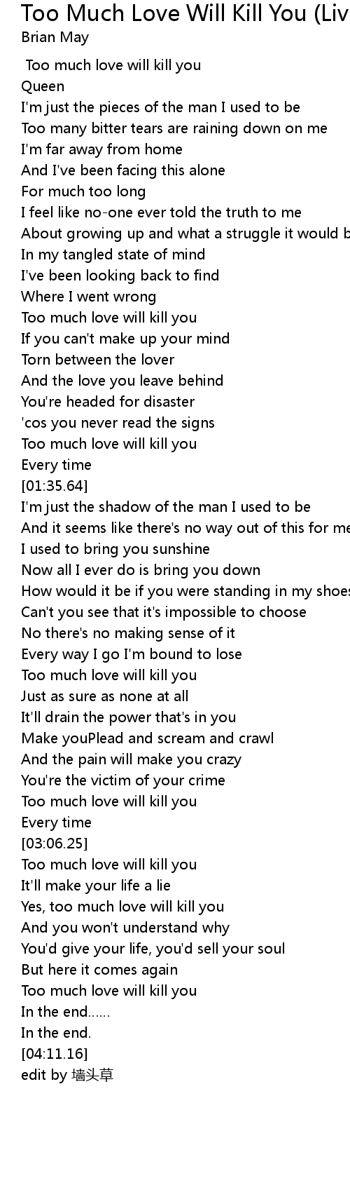 | [01:06.19] | Too much love will kill you |