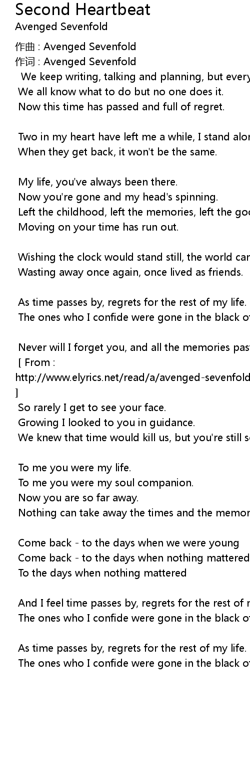 | From : http: www. elyrics. net read a avengedsevenfoldlyrics secondheartbeatlyrics. html | |