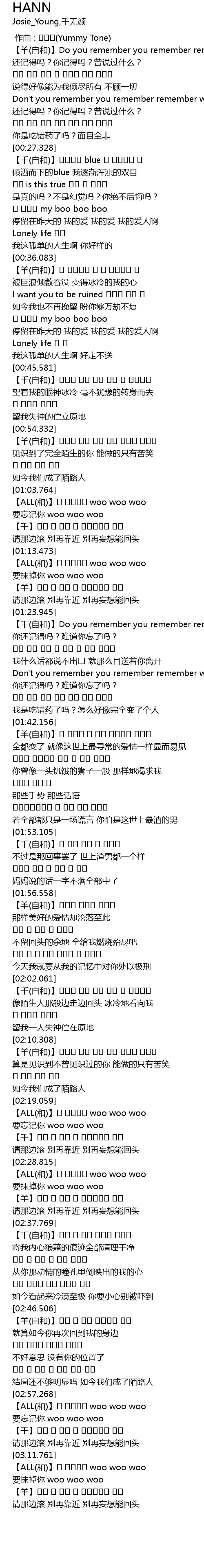 | [01:25.147] | qiān zì hé Do you remember you remember remember what you said |