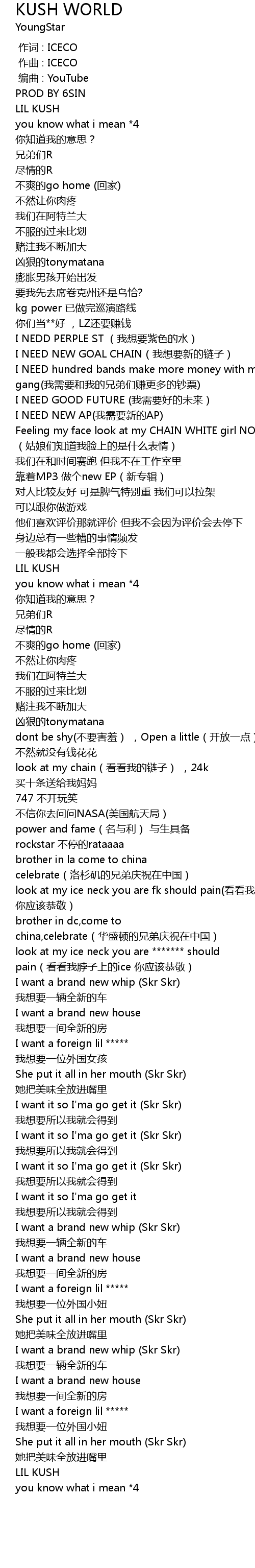 | [02:10.447] | look at my ice neck you are fk should pain kàn kàn wǒ bó zi shàng de ice nǐ yīng gāi gōng jìng |