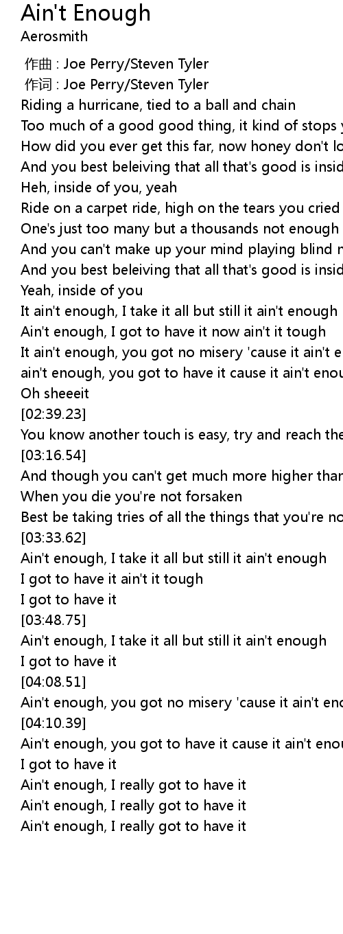 | [02:14.82] | ain' t enough, you got to have it cause it ain' t enough |