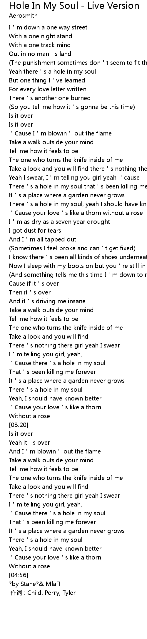| [01:28] | There s a hole in my soul, yeah I should have known better |