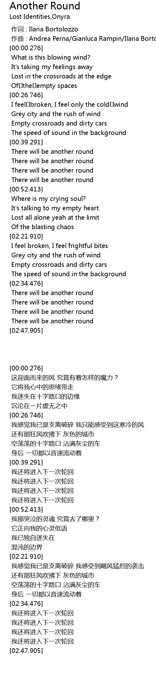 | [00:26.868] | I feel broken, I feel only the cold wind |