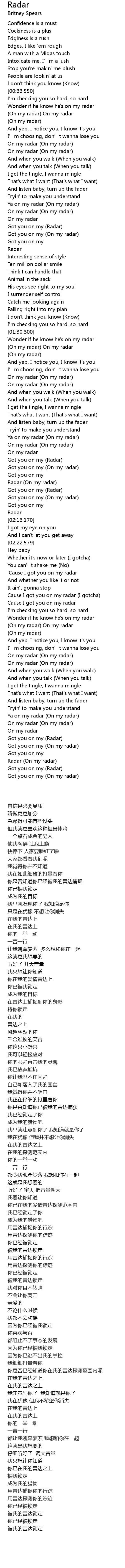 | [02:00.940] | Got you on my (Radar) |
