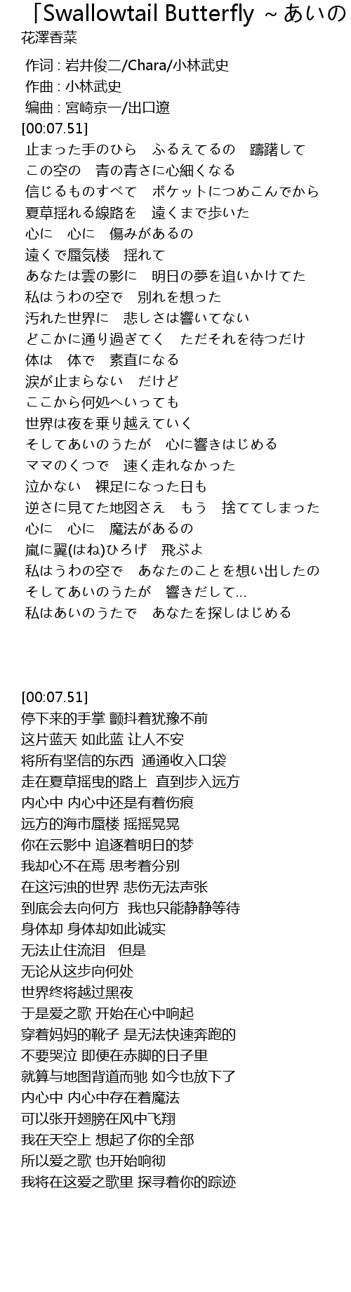 | [04:10.14] | 私はあいのうたで あなたを探しはじめる |