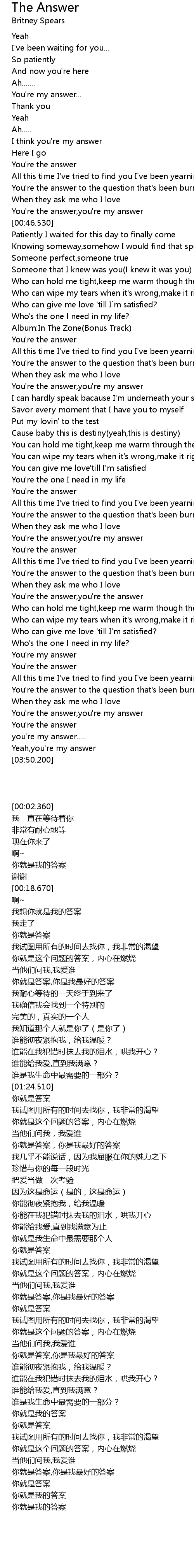 | [03:28.250] | You' re the answer to the question that' s been burnin' |