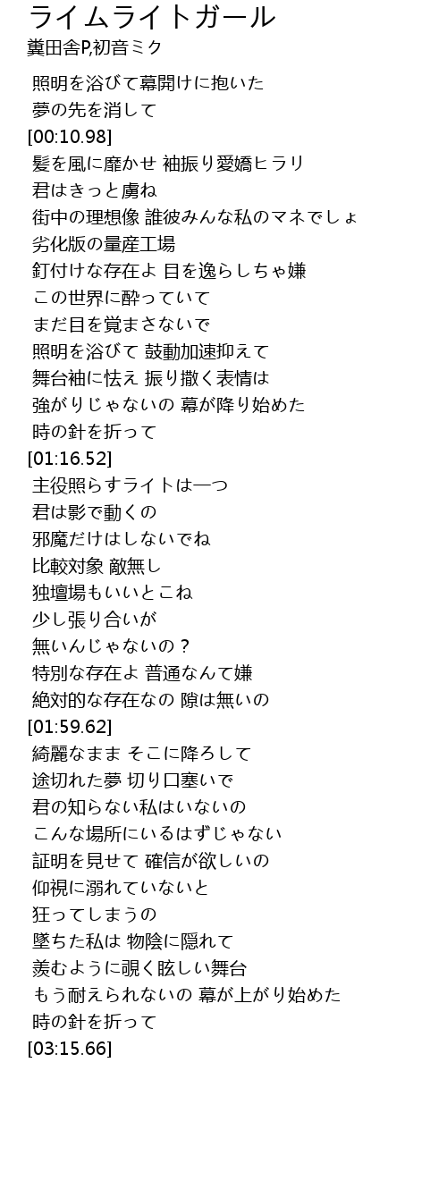 | [00:00.56] | 照明を浴びて幕開けに抱いた |