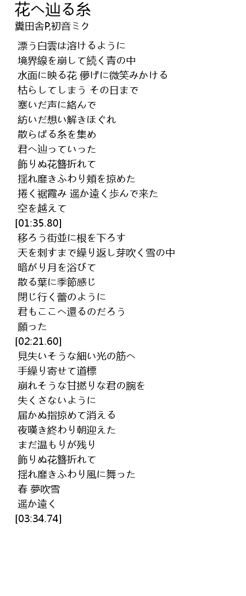 | [01:47.78] | 天を刺すまで繰り返し芽吹く雪の中 |