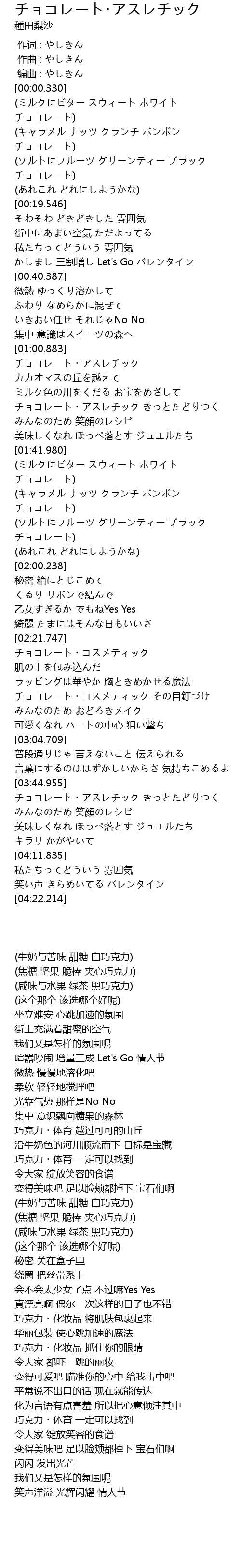 | [01:46.462] | (キャラメル ナッツ クランチ ボンボン チョコレート) |