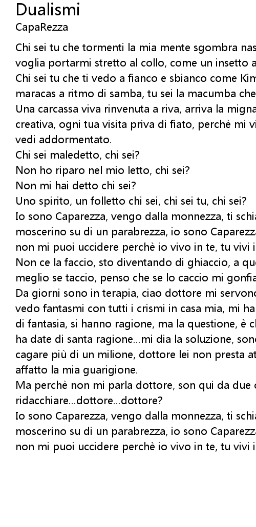 | Io sono Caparezza, vengo dalla monnezza, ti schiaccio sul cuscino come un moscerino su di un parabrezza, io sono Caparezza, tutt' altro che una carezza, non mi puoi uccidere perche io vivo in te, tu vivi in me. | |