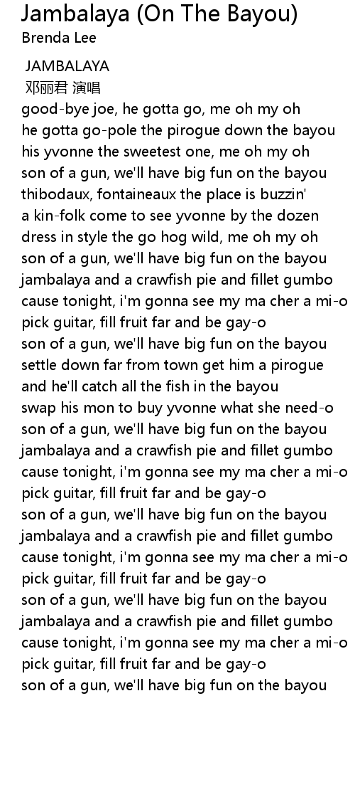 | [00:49.25] | son of a gun, we' ll have big fun on the bayou |