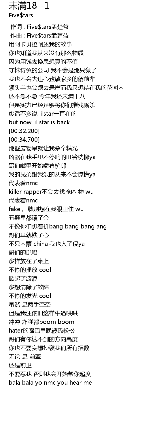 | [00:00.000] | 作词 : Five$tars孟楚益 |
